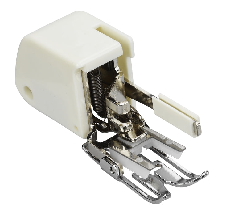 Difficult-to-work-with fabrics are best sewn using the Walking Foot. It supports the fabric feed by a second feed dog on the upper side of the foot. The sewing project is moved simultaneously by the two feed dogs which allow a smooth sewing process.