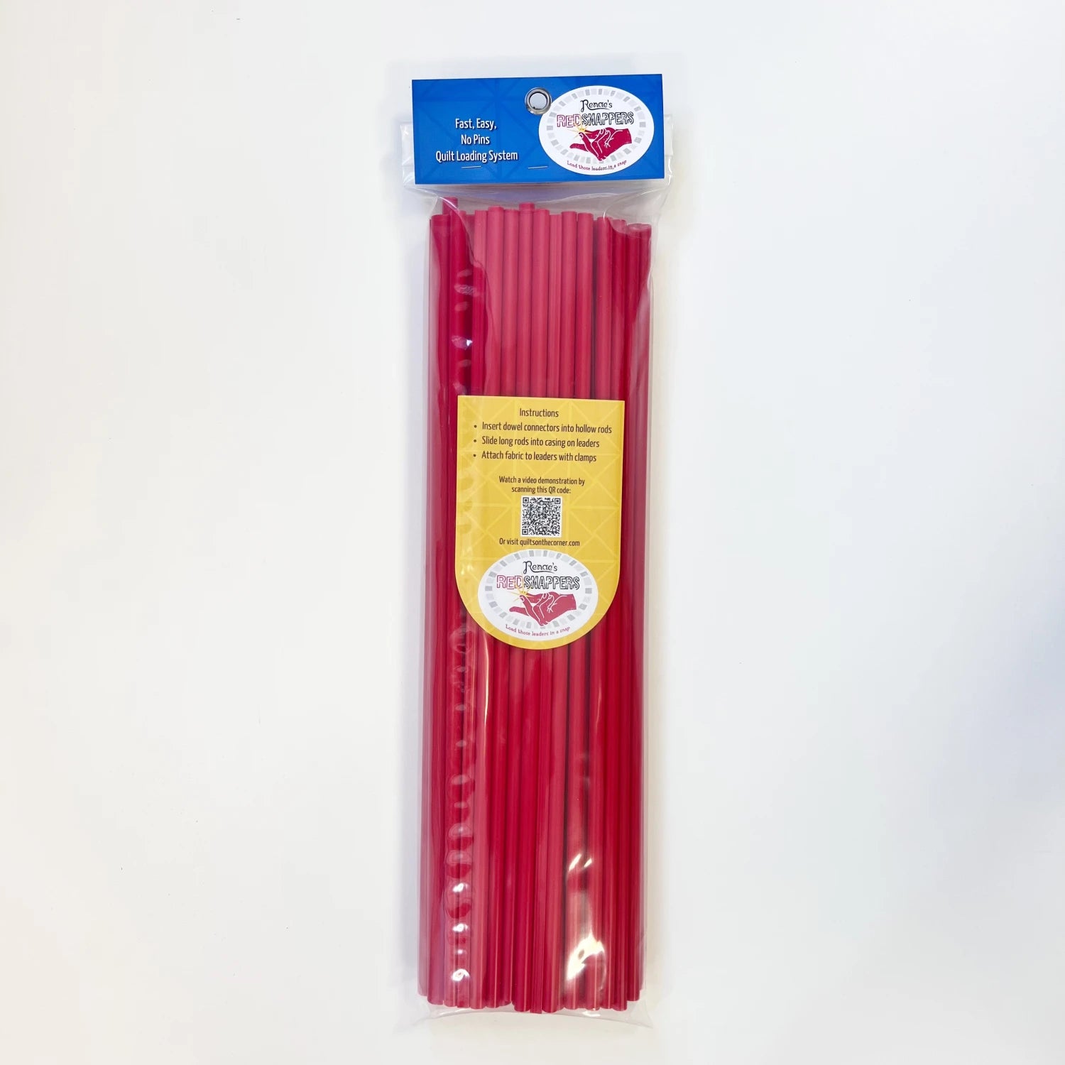 Experienced Longarm quilters know that using Red Snappers to attach the quilt top and backing to the frame quickly, accurately and easily makes longarm quilting a joy. Often loading the quilt on the frame is daunting if the quilter has to pin all the edges. Red Snappers eliminate the need to pin. You can quickly press the clamp over the rod, clamping on the edge of the quilt to hold it tight and secure. Red Snappers come with enough rods and clamps to attach to three poles.